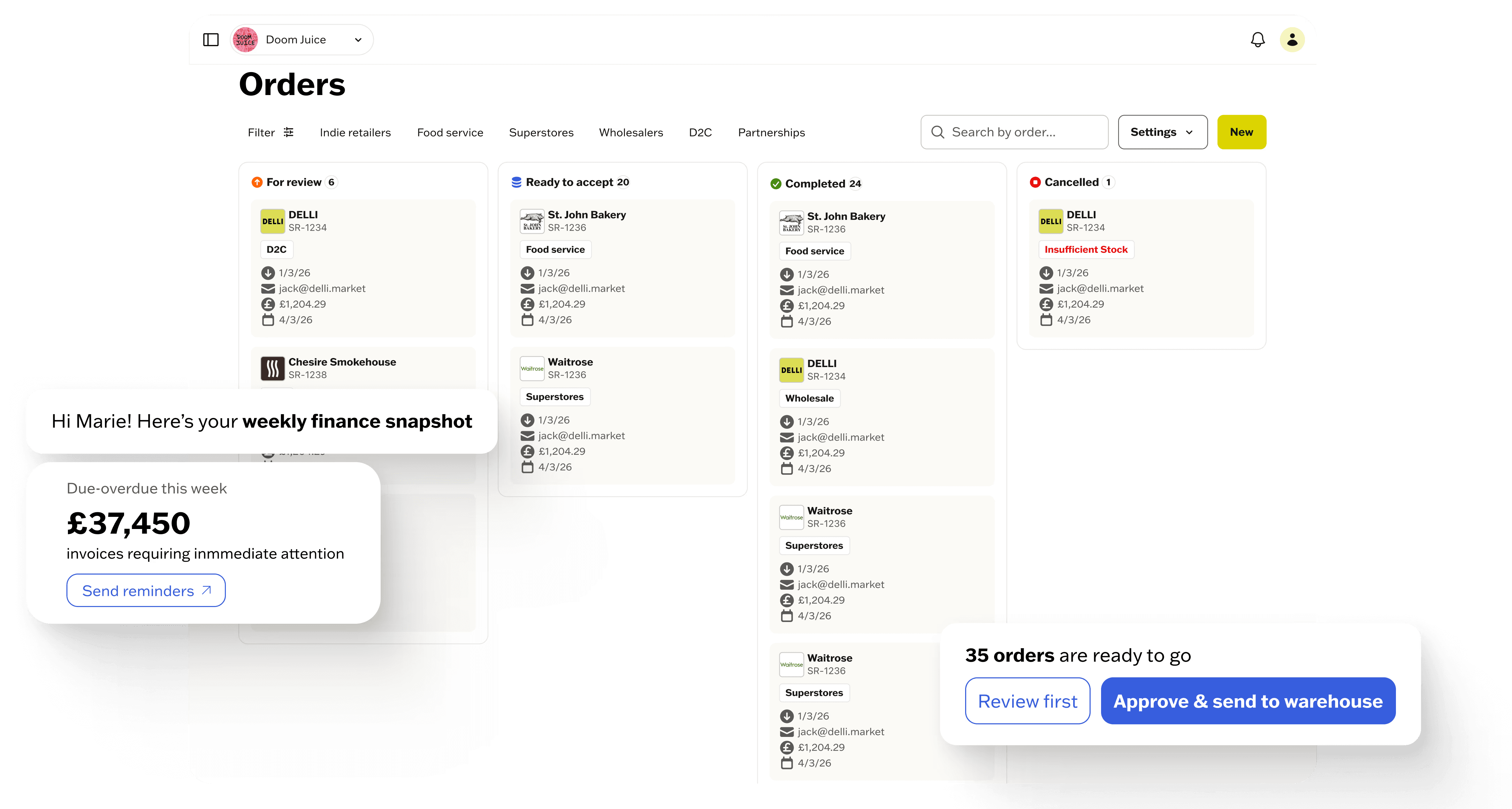 DELLI AI is proactive. It spots the patterns you don’t have time to look for. A customer who hasn’t ordered in a while. Inventory that is not moving. Channel that is not profitable. You get a clear action. One click.